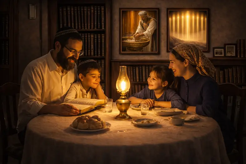 Moshe descends from Sinai with a radiant face, symbolizing the transformative power of Torah. Through Shabbos, mitzvos, and study, covenant life becomes a source of light and guidance for everyday life.